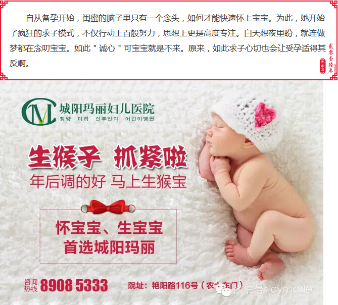 本文信息内容仅供参考。如果您的身体有不适症状,请及时到医院就诊,明确诊断后按医嘱治疗。 为了方便您更好地了解疾病相关信息,城阳玛丽妇儿医院开设了专家免费“在线咨询”服务您可以直接点击与专家在网上对话。 您也可以直接拨打健康热线:0532-85652962 本网站还提供“网上挂号”、“有问必答”等服务内容,欢迎您选择,我们将为您提供热诚服务,并保护您的隐私。祝您健康!