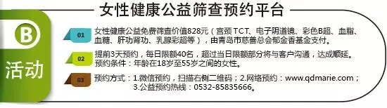 记者了解到,该平台启动后,岛城市民不出家门即可预约北京协和医院、北京301医院、上海同济大学附属医院等妇产科专家,与专家面对面交流、问诊与手术。与此同时,该平台每日挂号前40名将免特需妇产科专家挂号费(300元)。此外,18岁至55岁之间的女性可享受妇科常规检查、电子阴道镜、白带常规、尿常规、彩色B超、心电图、肝功能8项、肾功能3项、血糖、血脂2项、宫颈液基薄层细胞制片术TCT、乳腺红外线检查、乳腺彩超、乳腺触诊等检查(总价值828元),两项活动的费用均由青岛市慈善总会郁金香基金进行专项援助。