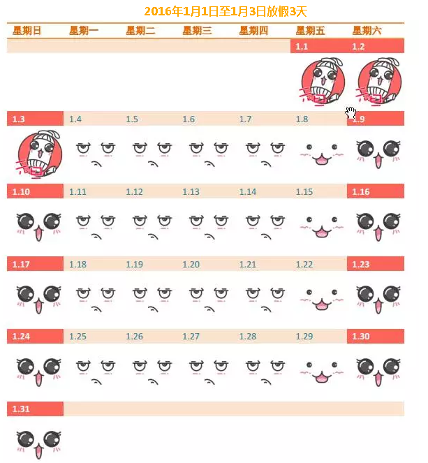 基本情况:2016年1月1日至1月3日调休,放假3天。1月4日(星期)照常上班。