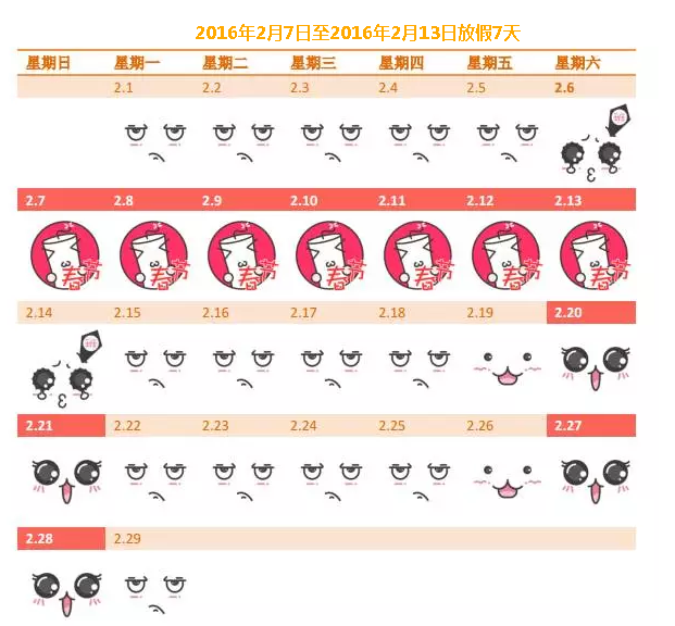 基本情况:2016年2月7日至2016年2月13日调休,放假7日。2月6日(星期六)、2月14日(星期日)公休调至2月11日(星期四)、2月12日(星期五)。因此这两天照常上班。