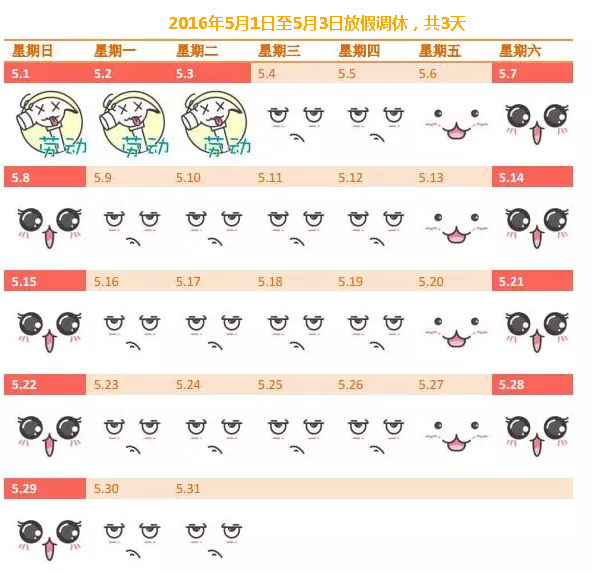 基本情况:2016年5月1日至5月3日放假调休,共3天。4月30日(星期六)上班。