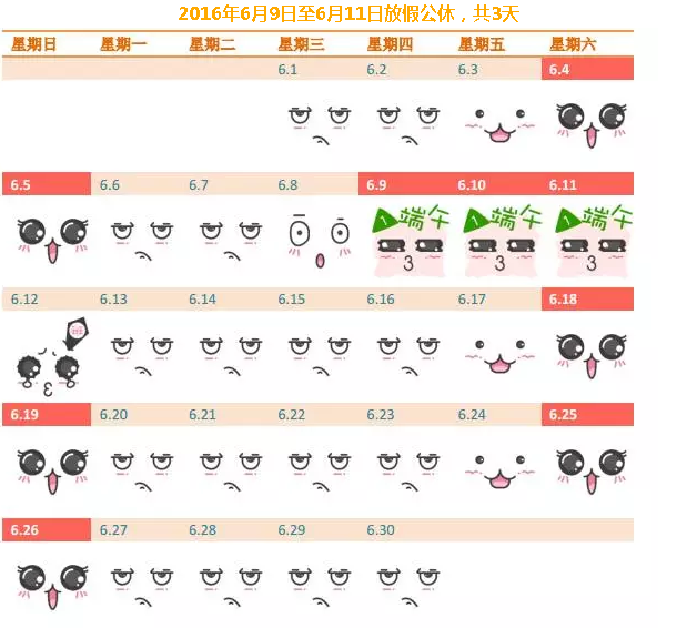 基本情况:2016年6月9日至6月11日放假公休,共3天。6月12日(星期日)照常上班。