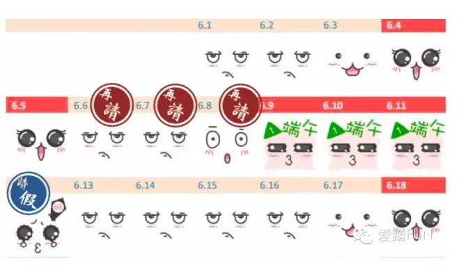 比较不好意思请假的保守党们只休4天,端午公休6月9-11日(周四-周六),周日6月12日请假天,就能够避开假后苦逼6天班了!