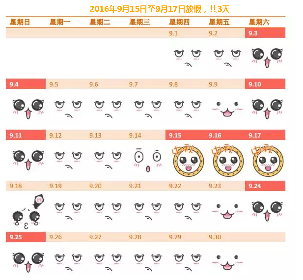 基本情况:2016年9月15日至9月17日放假,共3天。9月18日(星期日)照常上班。
