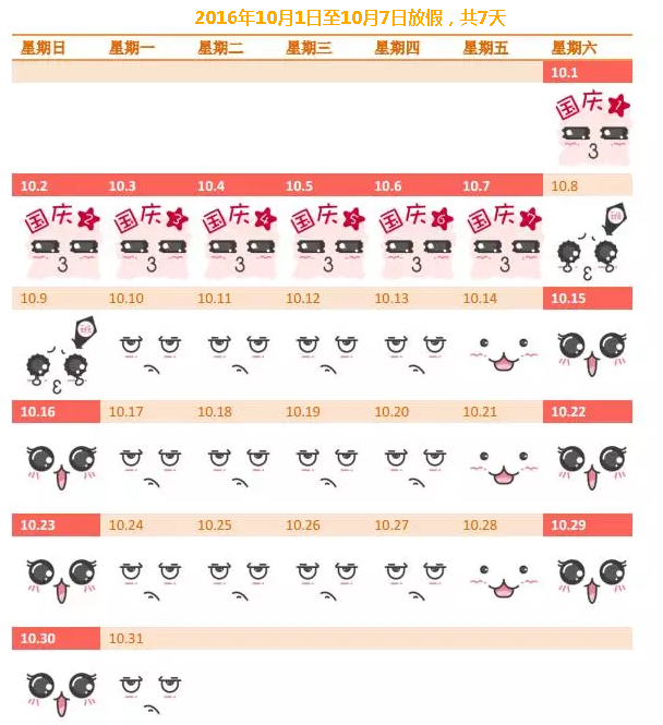 基本情况:2016年10月1日至10月7日放假,共7天。10月8号(星期六)10月9号(星期天)正常上班。