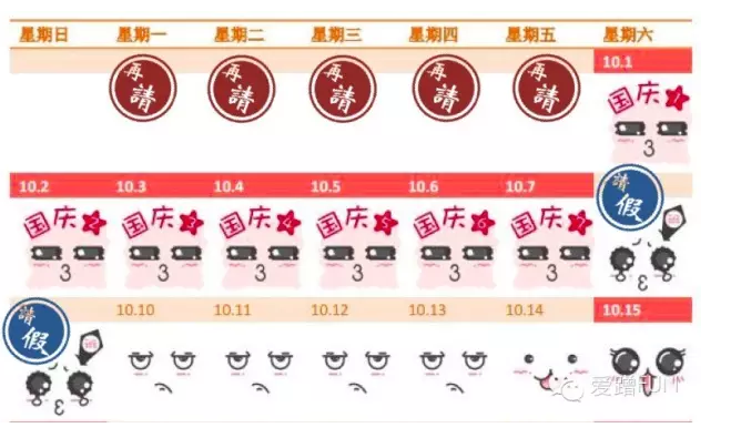 如果你是不羁放纵爱自由的人类可以选择休8天。9月10、11日是周末,12-14日请假3天,15-17日是公休,合起来就有满当当的8天了。教师节和中秋节都囊括在其中了哟!胆子再大点还可以把18号也请假了,那假期就真是那酸爽~