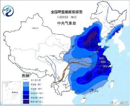 寒潮来袭,今后几天蓝色地区气温都会骤降,整个山东省已经蓝透了↓