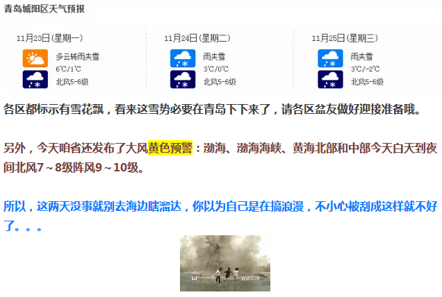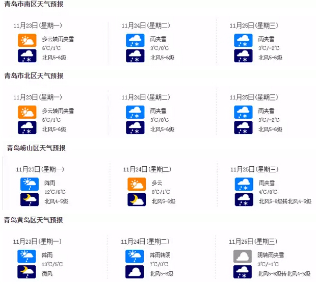 话说……昨天,朋友圈的网友忙活得很,纷纷晒着北京的雪景照片,约着要到北京去看雪 。相比之下的青岛,当天刚刚经历场降雨,似乎“汛期”被调整到了11月,阴雨天是接二连三地光顾,11月的平均降水量是常年的两倍多。BUT!!!受冷空气的持续影响,青岛市将迎来大风降温的天气 ,24日傍晚到25日,大部分地区有雨夹雪或阵雪天气。 再来看看青岛各区的情况↓↓↓ 说到下雪,还真是有点小兴奋,好想明天早推开窗,就是这种景象啊↓↓↓