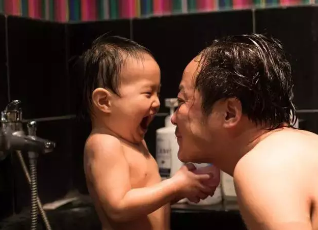 爸爸兑现白天的诺言,带小树浴缸里玩水,顺带洗澡。
