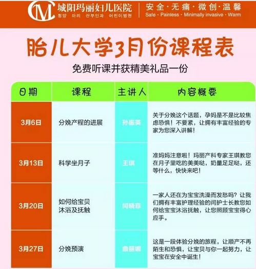 城阳玛丽妇儿医院胎儿大学,为每位孕妈妈提供孕期全程知识辅导,孕期科学健康饮食指导、产前健康指导,祝你生出黄金标准健康宝宝!每周末均有精彩课程,欢迎您的参加
