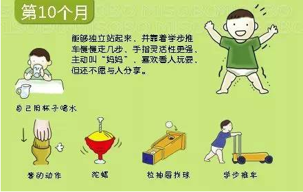 可以扶物站立、喜欢敲打能够发出声音的物品,手部动作更加灵活