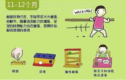 能够扶物行走、手指灵活性大大增强,变得好动,能说简单的单字
