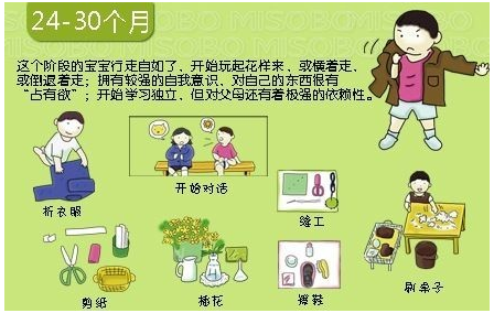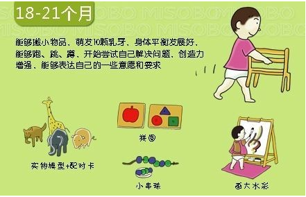 能够搬动小物品,身体平衡力发展良好,开始尝试自己解决问题,能够表达自己的一些意愿和要求