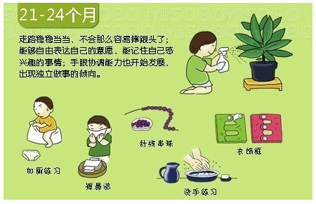 能够独立做一些事情,如洗手、上厕所等;手眼协调能力进一步加强;可以做一些简单的家务,如浇花等。
