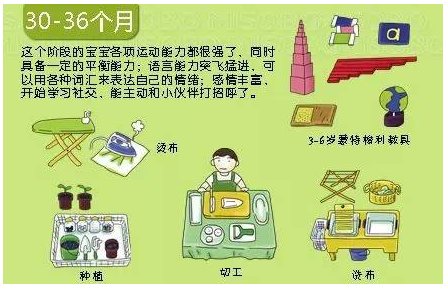 独立穿衣服、折衣服;也可以做些家务,如擦桌子、擦鞋等;语言能力得到进一步提升,可以跟别人展开对话