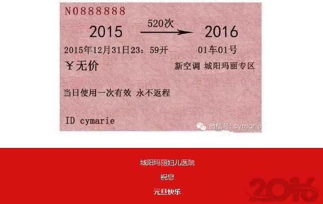 迎着新年的钟声,我们迎来了崭新的2016年,愿2015的时间齿轮,带走疾病、痛苦、压力、焦躁和不爽,愿2016的快车装满幸福的美酒,快乐的餐具,健康的美食,和睦轻松的空气。城阳玛丽妇儿医院特邀您起乘坐2016号列车,开始2016年美好的旅程!