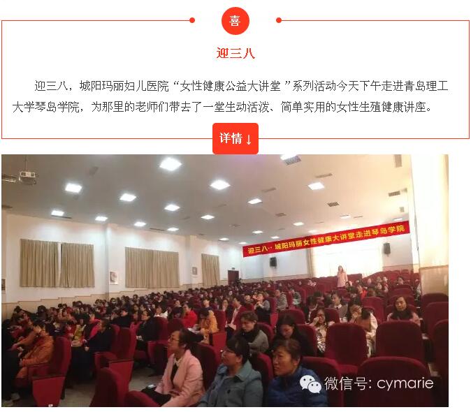 ★下午不到1点,青岛理工大学琴岛学院的老师们便陆续到场,讲座准时开始了。在讲座中,鞠陆琪主任讲述了妇女健康知识及保健常识,从女性的生理特点、卵巢保养,到阴道流血、白带异常、下腹痛、下腹包块,再到宫颈、乳腺疾病筛查与预防,以形象的图片、鲜活的事例、生动的语言,深度剖析了妇女常见病的临床症状、治疗方法、预防措施及健康保健常识,正确引导了大家对女性健康的认识。并建议大家每年做次健康体检,做到早预防、早发现、早治疗。整个会场气氛温馨而活泼,充满着欢乐、感动和幸福。★
